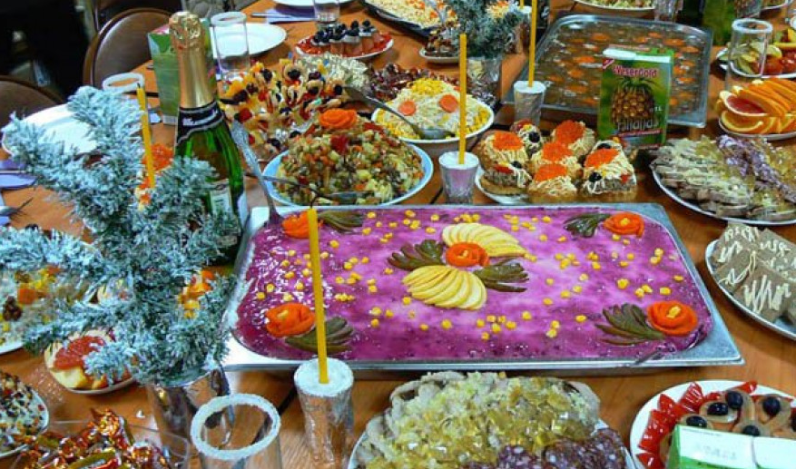 Ну а на новогодний стол с большим количеством собравшихся можно поставить общее блюдо, красиво украсив его сверху.