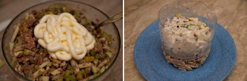 Соль я не добавляла, поскольку и рыба и майонез уже соленые и на мой вкус этого достаточно, однако вы смотрите сами — можете и подсолить.