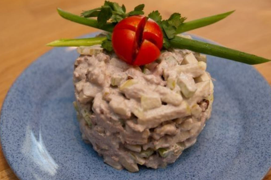Когда я впервые попробовала этот интересный и очень вкусный праздничный салат, то долго гадала, из чего же он состоит. Моя коллега, которая угощала им в свой день рождения, загадочно улыбалась и держала нас всех в неведении, пока мы не сдались. На удивление все оказалось просто — блюдо готовится быстро, за каких нибудь 10 минут из самых простых продуктов (тунца, яблок и стеблей сельдерея), но оказывается обалденно вкусным и необычайно эффектным.