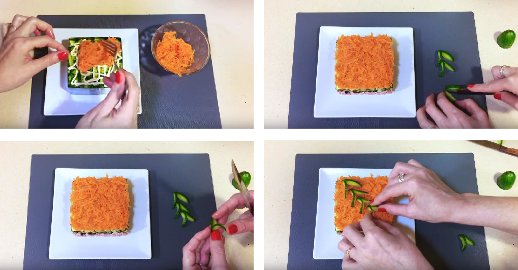 Теперь аккуратненько снимаем формочку и остается только украсить наше произведение. Для этого я просто отрезаю кусочек разрезанного вдоль огурчика 4 — 5 мм шириной, а затем разрезаю (не до самого конца) посередине, так чтобы получились лепестки толщиной 2 — 2.5 мм, как бы «раскрываю» и укладываю друг за дружкой.