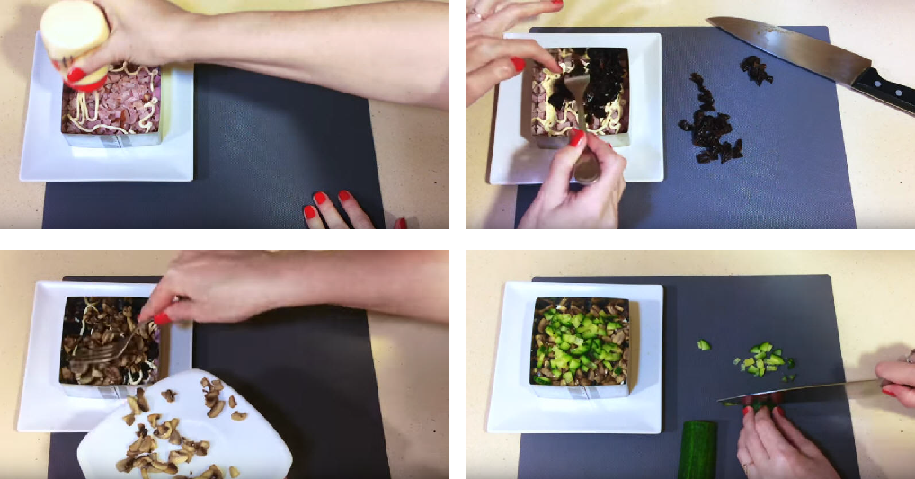 Далее идет слой уже успевших остыть жаренных грибочков, а сверху на них укладываем слой мелко порезанного свежего огурца.