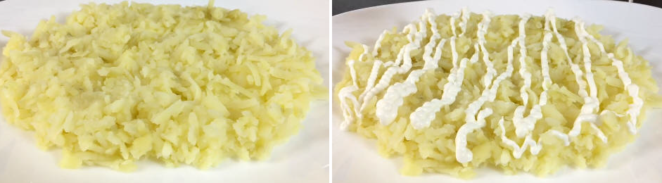Первый слой — отваренный и тертый картофель + немного майонеза