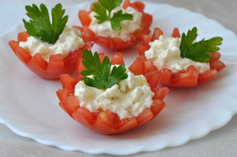 - Наполнить помидорные «чашечки» сырной массой. Украсить зеленью.
