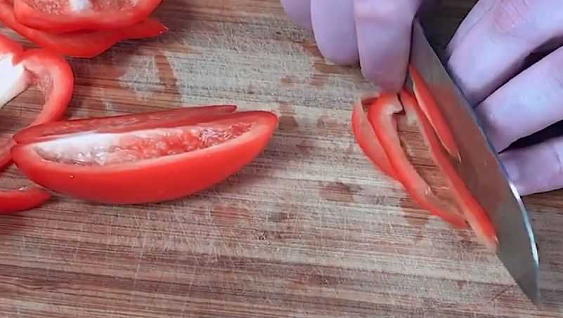 2.Пока на плите все греется и бурлит, можно заняться нарезкой овощей. Сладкий перец нужно измельчить длинными полосками. Постарайтесь сделать их очень тонкими.