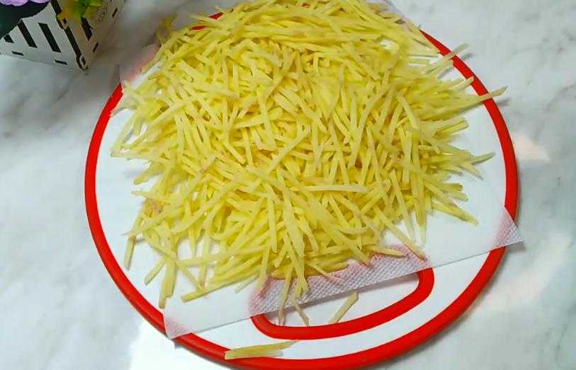 Картофель натереть на терке для корейских закусок, промыть в прохладной воде. Откинуть на сито, дать воде стечь в течение 20 минут. Высушить бумажными полотенцами и обжарить в растительном масле до румяности.