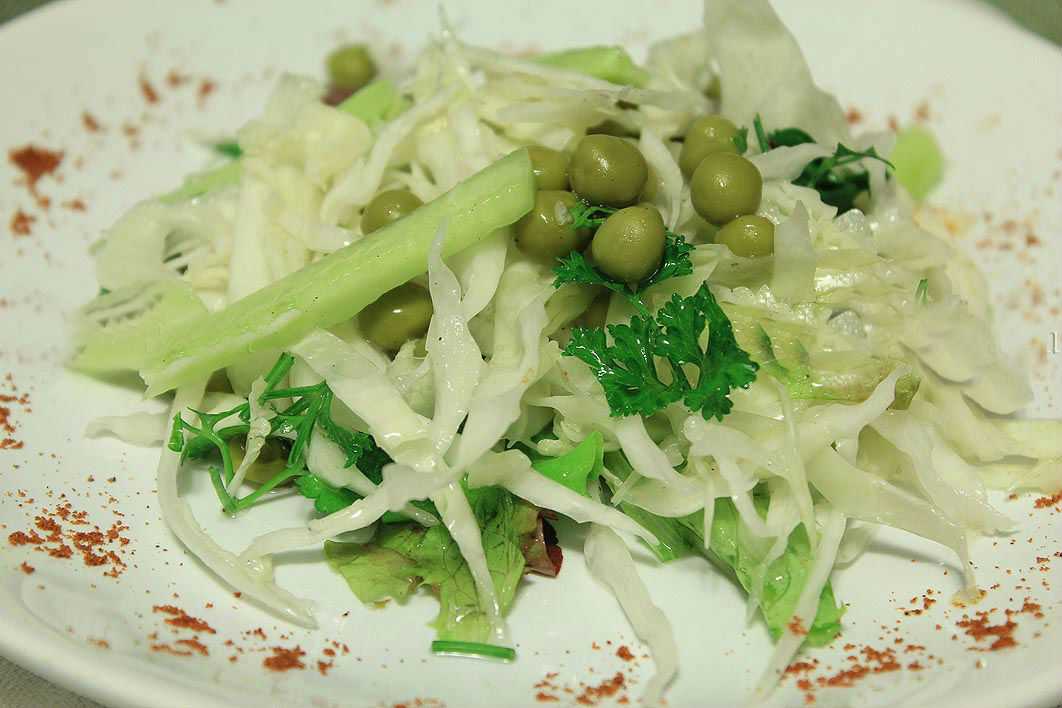- Лук и укроп промывают и рубят, добавляют в салат из капусты с зеленым горошком.