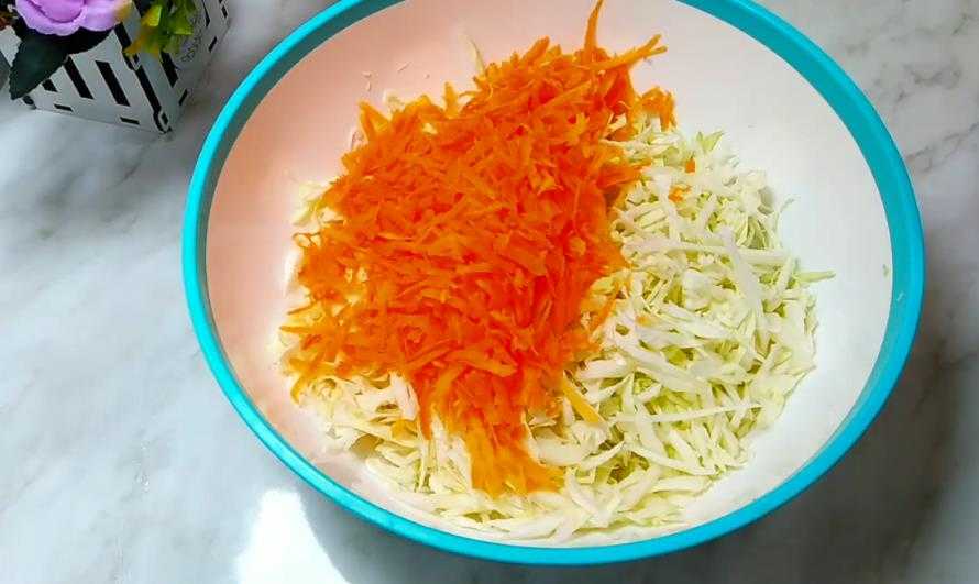 Тонко нашинковать капустный вилок. Натереть морковь на овощной шинковке. Посолить овощи и перемешать руками.