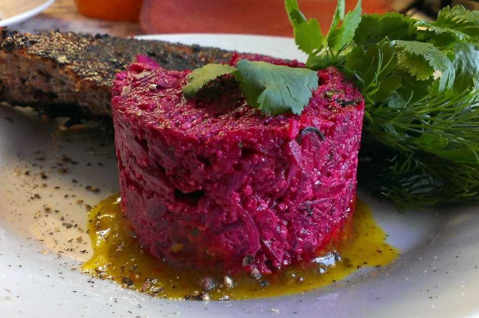 Т.е. рецепт без термической обработки. Овощ нужно хорошо промыть, очистить от кожицы и натереть на терке. Затем подготовить маринад, для чего нужно ядра орехов и чеснок перемолоть в блендере, смешать с сахарным песком, солью, специями, уксусом и маслом. Конечный этап приготовления: смешать маринад с тертой свеклой, дать постоять час-два в холодильнике, после чего можно употреблять.