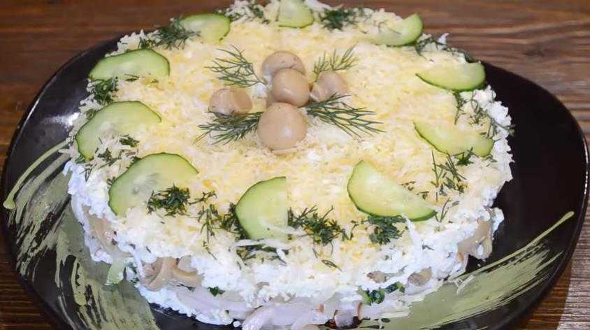 - Сделать слой из огурца, а потом, равномерно распределить по нему грибы, смешанные с луком. Сверху положить яичную стружку, посолить и поперчить ее.