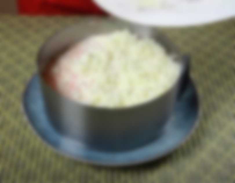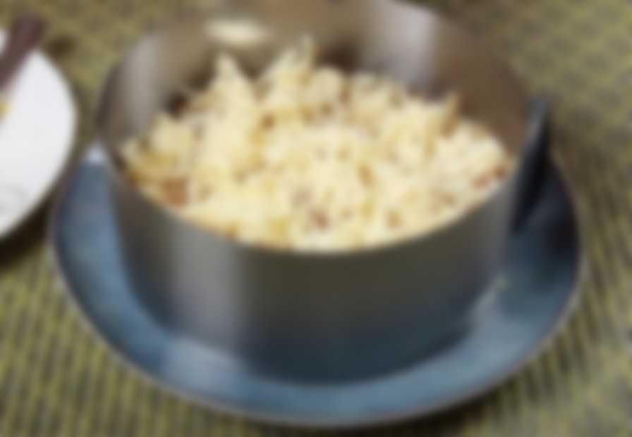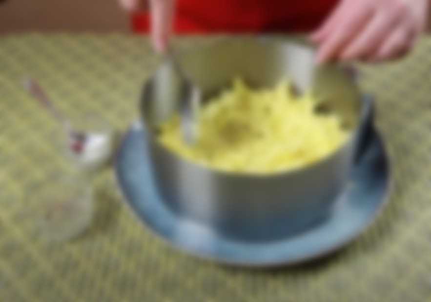 - На блюдо для сборки салата ставим разъемное кольцо и первым слоем отправляем картофель. Солим, немного перчим и смазываем майонезом.