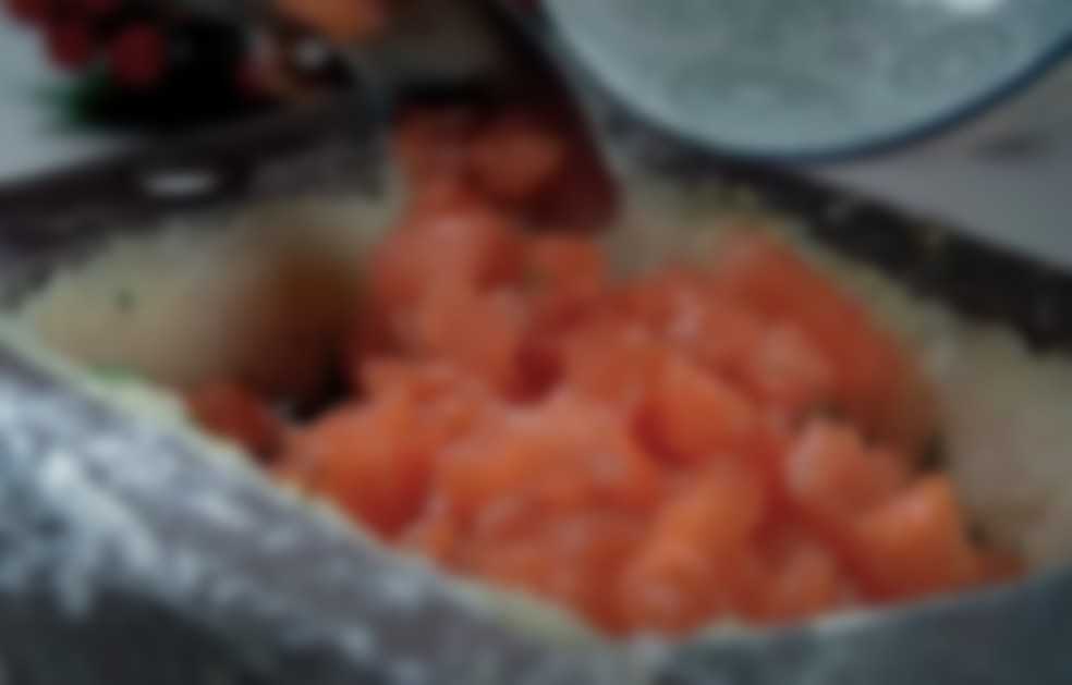 - Для начинки небольшими кубиками нарезаем красную рыбу, по отдельности на мелкой терке измельчаем белки и желтки.
