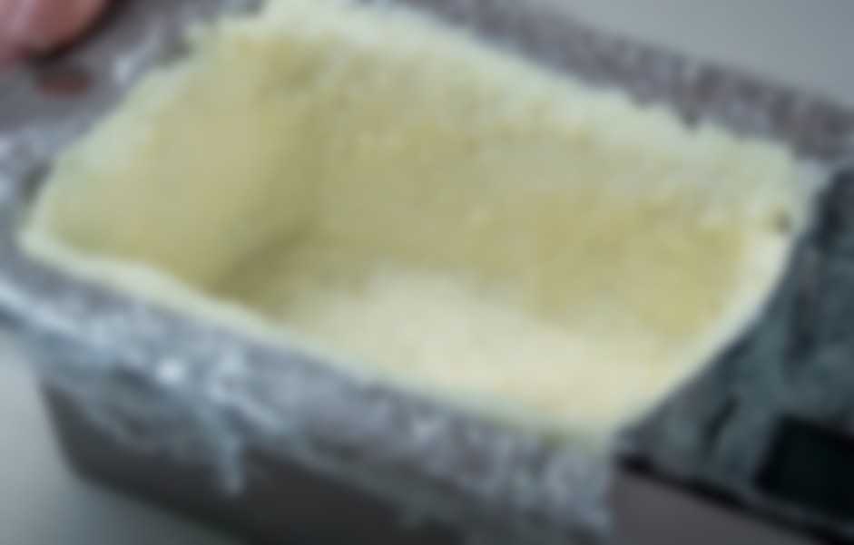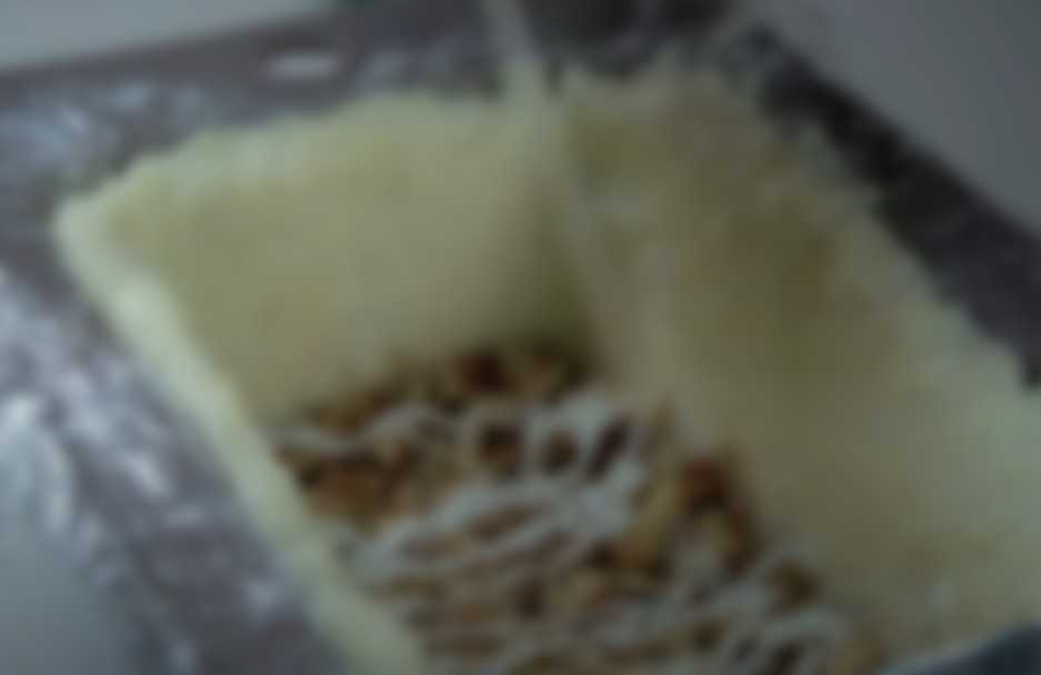 - Внутри формы распределяем сырную массу, формируем дно, бока, при этом хорошо прижимаем ложкой, чтобы слой получился ровным.