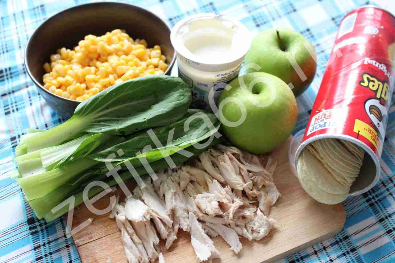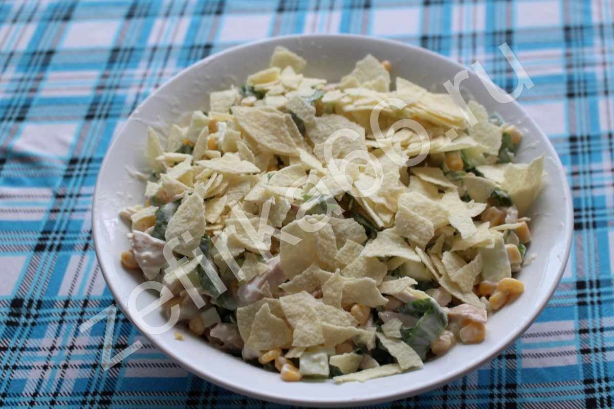 Легкий и быстрый в плане приготовления салат, в который входят стандартные ингредиенты, находящиеся в любом магазине. Чипсы стоит брать с острым вкусом, желательно с луком или чесноком. Тогда они будут отлично выделяться в блюде и придавать ему дополнительный вкус и аромат. Готовится данное блюдо слоями.