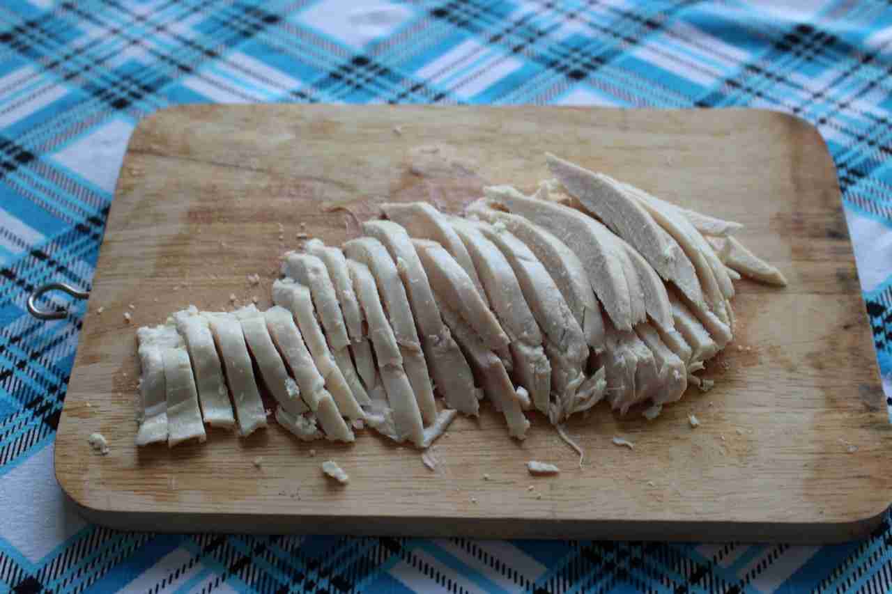 Сверху выкладываем куриное филе. Сегодня я использую копченое куриное филе. Нарезаем тонкими полосками. Выкладываем на морковь. Можно отварить или поджарить филе, нарезаем также.