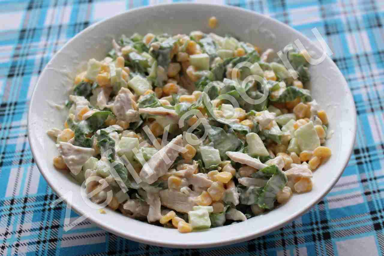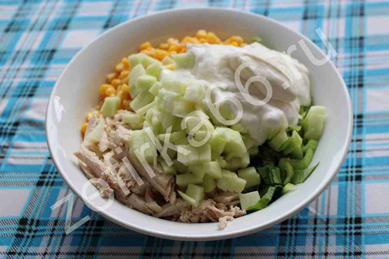Быстро смешиваем консервированную кукурузу, яблоки, пока они не начали темнеть, курицу и салат.