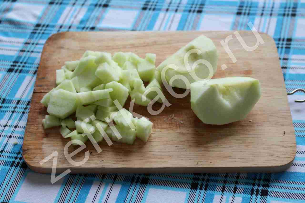 Яблоко режем кубиками, предварительно очистив от кожуры. Лучше брать кислые и сочные сорта яблок.