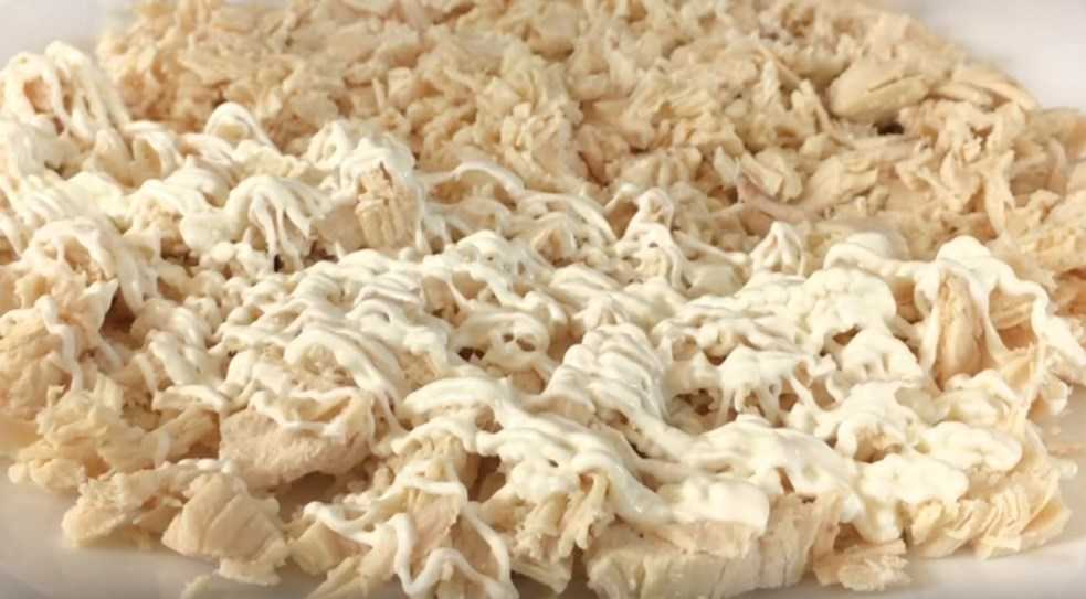 2. Куриное филе нарезаем и выкладываем первым слоем, смазываем майонезом.