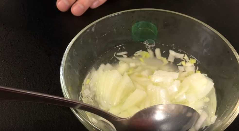 1. Первым делом очистите лук и порежьте на ломтики. Сразу же замаринуйте его, используя уксусно-водный раствор с сахаром.