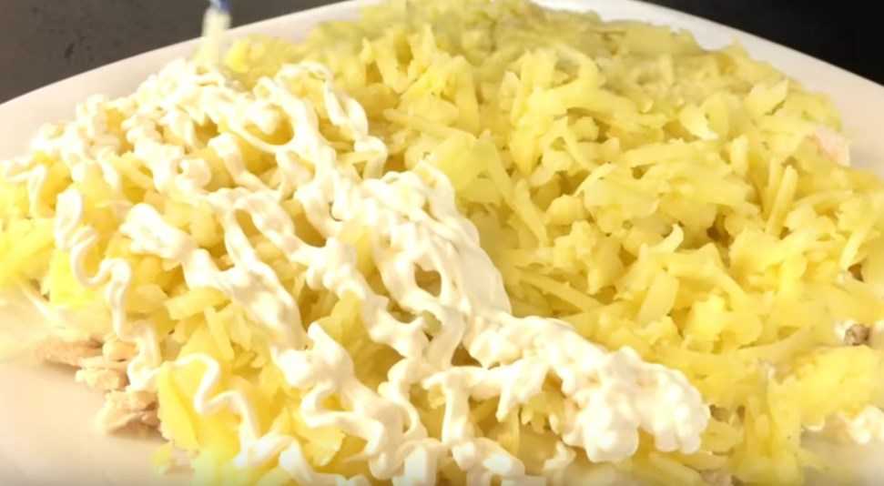 3. Затем кладем маринованный лук, тертый картофель, майонез.