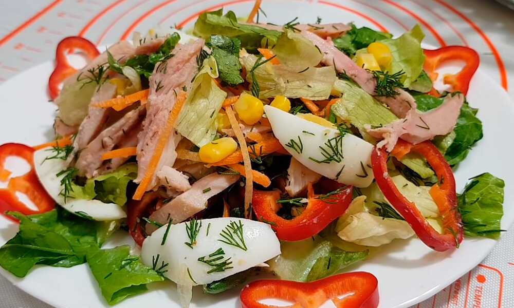 Закуска, от которой трудно оторваться, пока не закончится. Легкая копченость мяса придаст блюду изысканный вкус, благодаря чему салат не потеряется на праздничном столе.