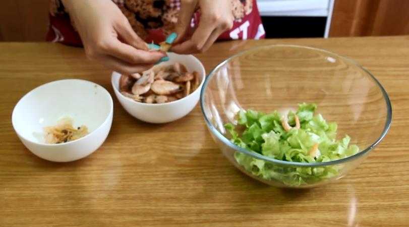 Креветочное мясо и кусочки грибов отлично сочетаются в домашних салатах. Оба ингредиента богаты натуральными белками, поэтому закуска выходит удивительно питательной, насыщенной и полезной.