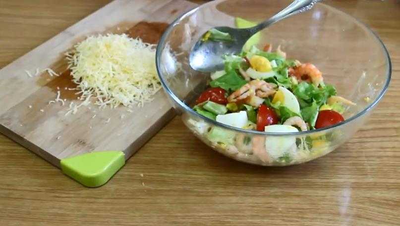 - В салатнике соединить креветок, лук, зелень, сыр и остывшие грибы.