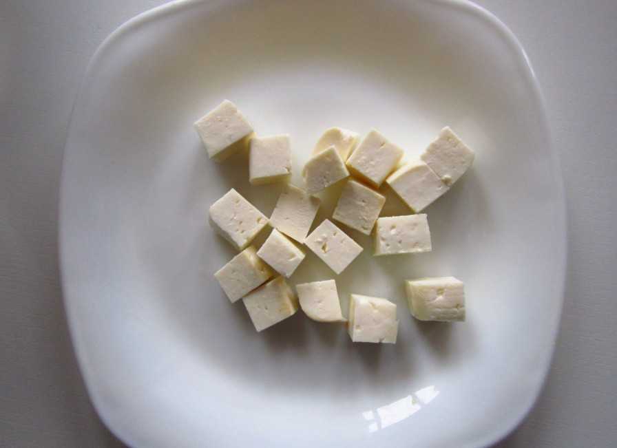 | 4 Готово | 300 г отваренной куриной грудки нарезаем кубиками. |