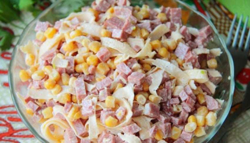 Очень вкусный салат из блинов с колбасой