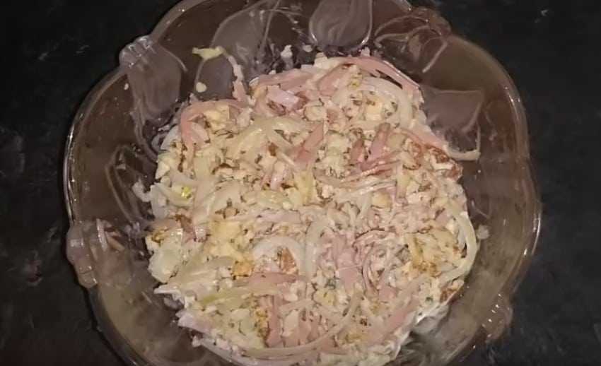 Очень вкусный блинный салат с вареной колбасой и луком