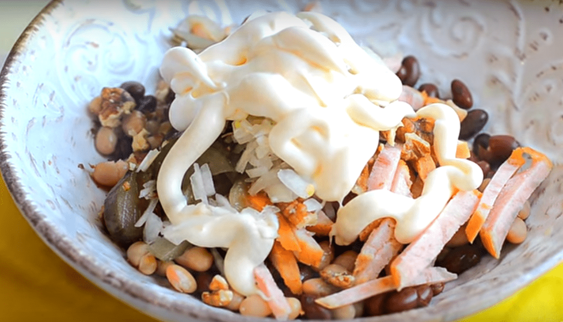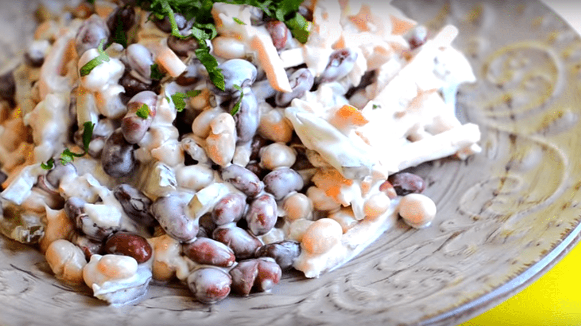 Попробуйте приготовить вкусный салат с фасолью и сухариками или копченой курицей, а для любителей овощных блюд есть рецепт классического винегрета.
