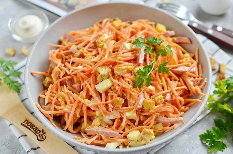 Этот салатик можно приготовить в трех разных вариантах – со свежей морковью, слегка обжаренной или корейской. Каждый будет по-своему хорош. Сухарики можно сделать дома или использовать магазинные.