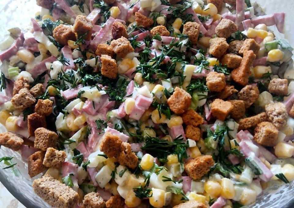 Салат с кукурузой и копченой колбасой, рецепт с сухариками