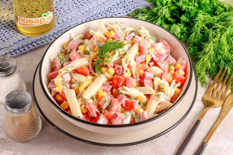 Этот сытный и аппетитный салат станет отличным вариантом для обеда или ужина. В нем есть все, что нужно – макароны, ароматная колбаса, овощи, а также простая заправка, которую всегда можно разнообразить специями или зеленью.
