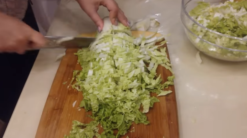 1.Пекинску капусту хорошо вымойте и нарежьте на кусочки. Не нарезайте плотную часть листьев у основания, чтобы сохранить нежность структуры.
