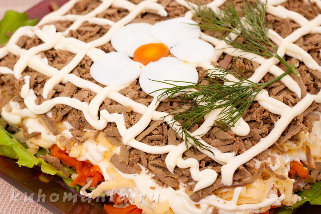 Рецепт 6, пошаговый: слоеный салат с печенью и морковью