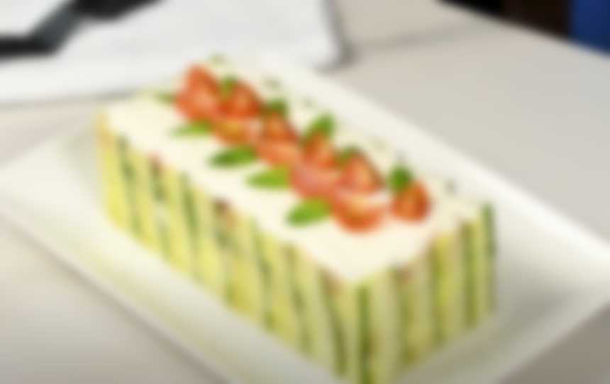 - Прямоугольную формочку смазываем внутри маслом и боковые стенки оформляем тонко нарезанными слайсами свежего огурца.