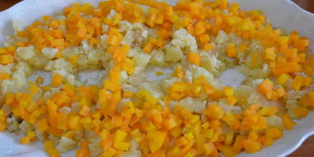 Первым слоем кладём натёртый на тёрке отварной картофель.