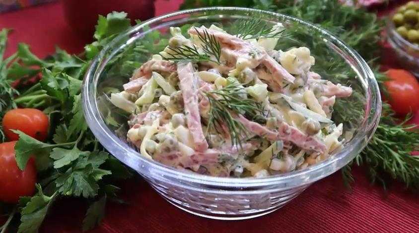 Классический Зимний салат Оливье с мясом курицы, горошком и солеными огурцами