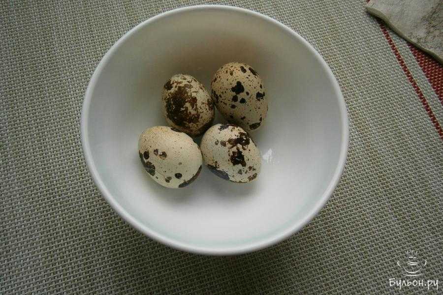 Перепелиные яйца отварите в кипятке 3-4 минуты, затем охладите в холодной воде. Снимите скорлупу, разрежьте яйца пополам.