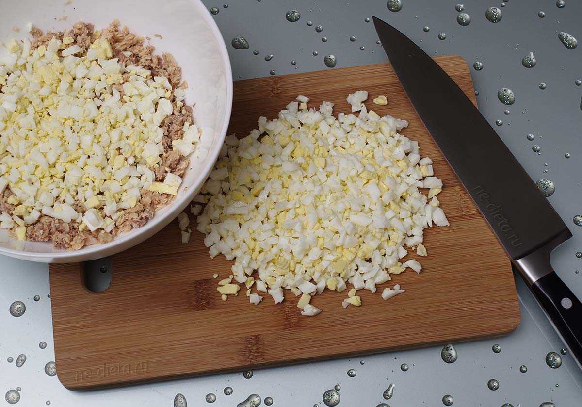 - Отдельно отварить яйца, а затем очистить их и меленько покрошить.