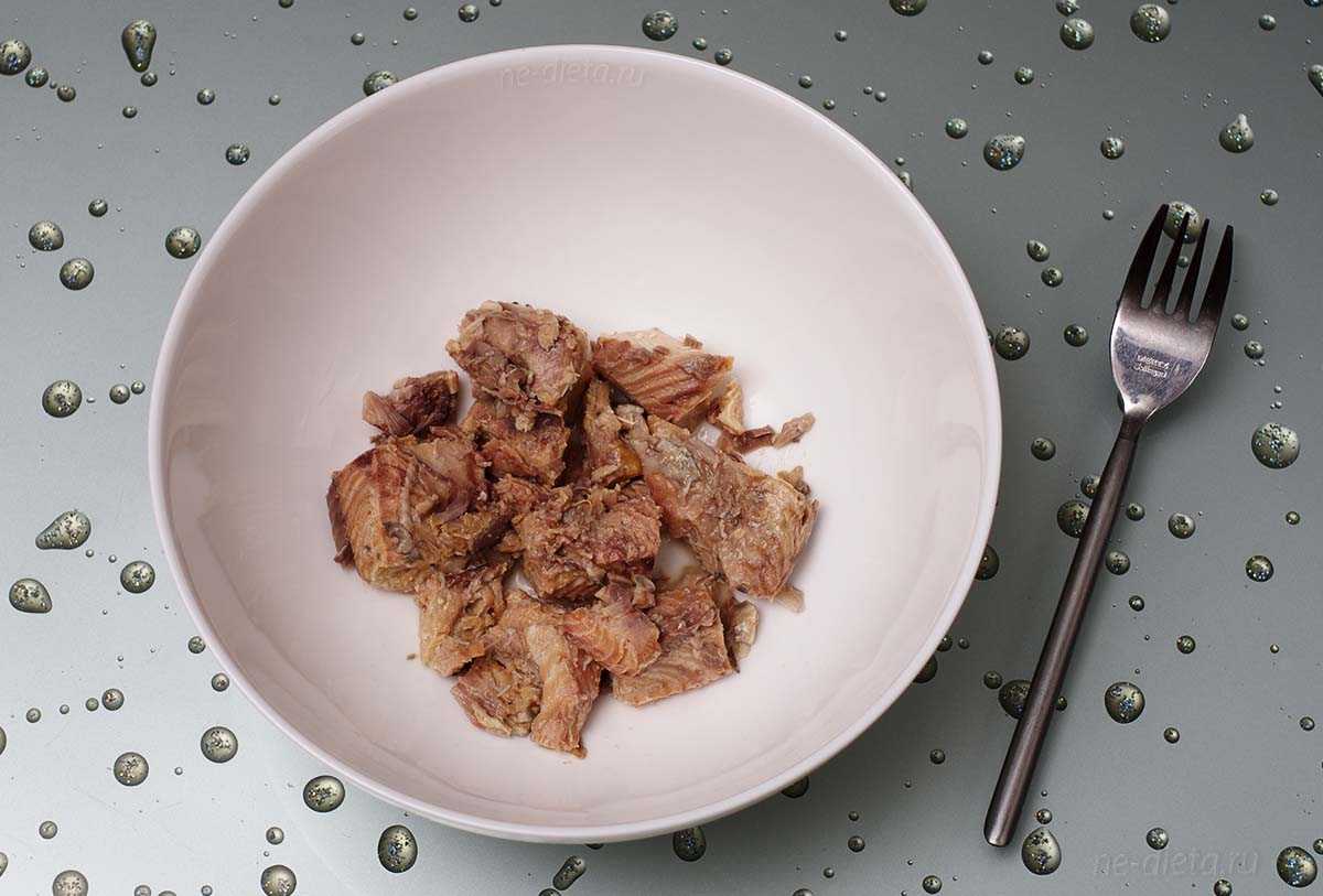 Шаг 5. Приготовим сразу рыбную консерву. Открываем баночку и прямо в ней, немного измельчим кусочки рыбы вилкой. Не сильно, так чтобы рыбные кусочки чувствовались.
