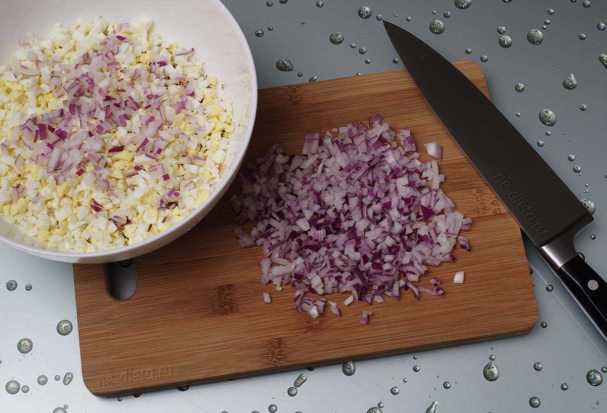 - Рубят лук и заливают на несколько минут кипятком, который удалит горечь.