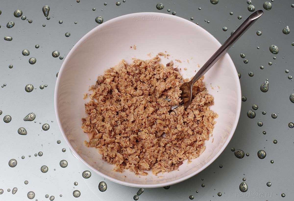 - Рыбу извлечь из консервной банки и размять ее, используя обычную столовую вилку.