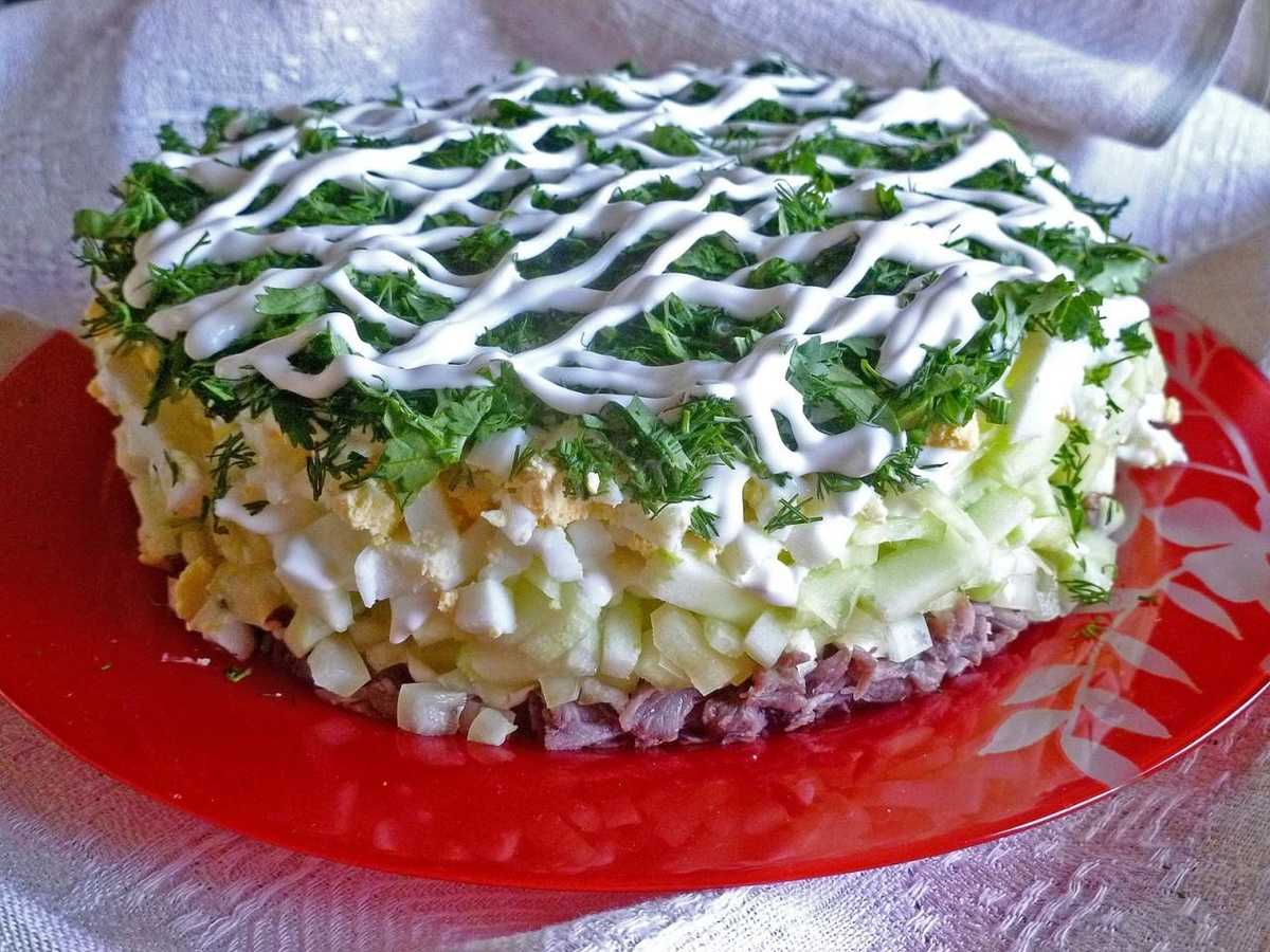 Этот красивый и вкусный слоеный салат готовят по классическому рецепту из небольшого количества продуктов, основным компонентом которого является говядина.