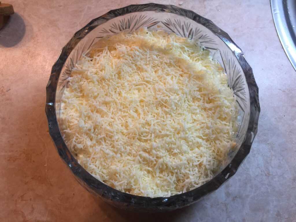 5. Всю заготовку хорошо пропитайте майонезом, а сверху посыпьте тертым белком. Порежьте тонкими полосками красный перец и сделайте клюв, бородку, крылышко и хвостик, горошиной обозначьте глаз.