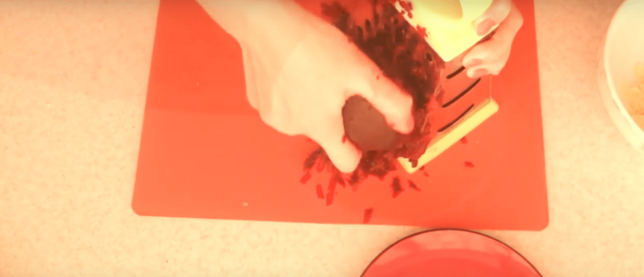 Натереть испеченные и почищенные свеклы при помощи крупной терки или на терке для корейской морковки.