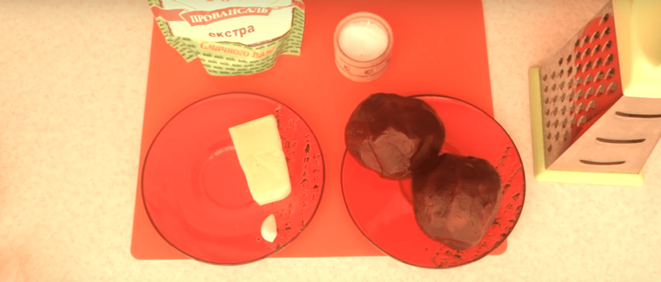 - Вареные овощи (картофель, свеклу, морковь) почистить и натереть на крупной терке.