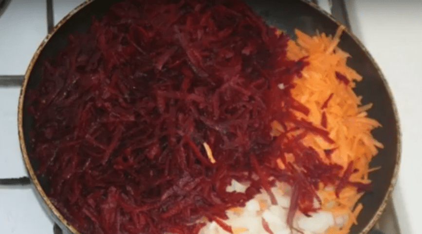 - Обжариваем на растительном масле репчатый лук и болгарский перец в течение 4-5 минут до легкой прозрачности лука. Кладем в сковороду морковь и свеклу, пассируем овощи в течение 8 минут на медленном огне.