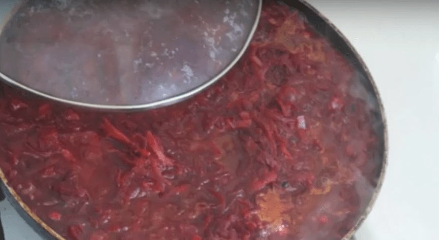 В томатную пасту влейте растительное масло, выставите на плиту, чтобы смесь закипела. Затем сделайте закладку из свеклы и уксуса 50 мл, чтобы овощи не потеряли свой алый цвет. Тушите 15 минут на среднем режиме плиты. После добавьте тертую морковку и резанный на кубики репчатый лук.