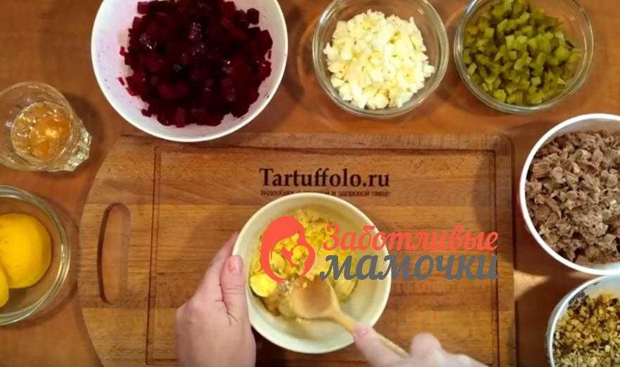 Желтки вареных яиц помещаем в чашу, добавляем в них готовую горчицу, измельченный чеснок, половину сока из лимона, немножко присаливаем и можно добавить специи по вкусу. Все перетираем, вливаем растительное масло и доводим до однородной консистенции. Этот соус просто идеально подходит для мясного салата со свеклой Барин.